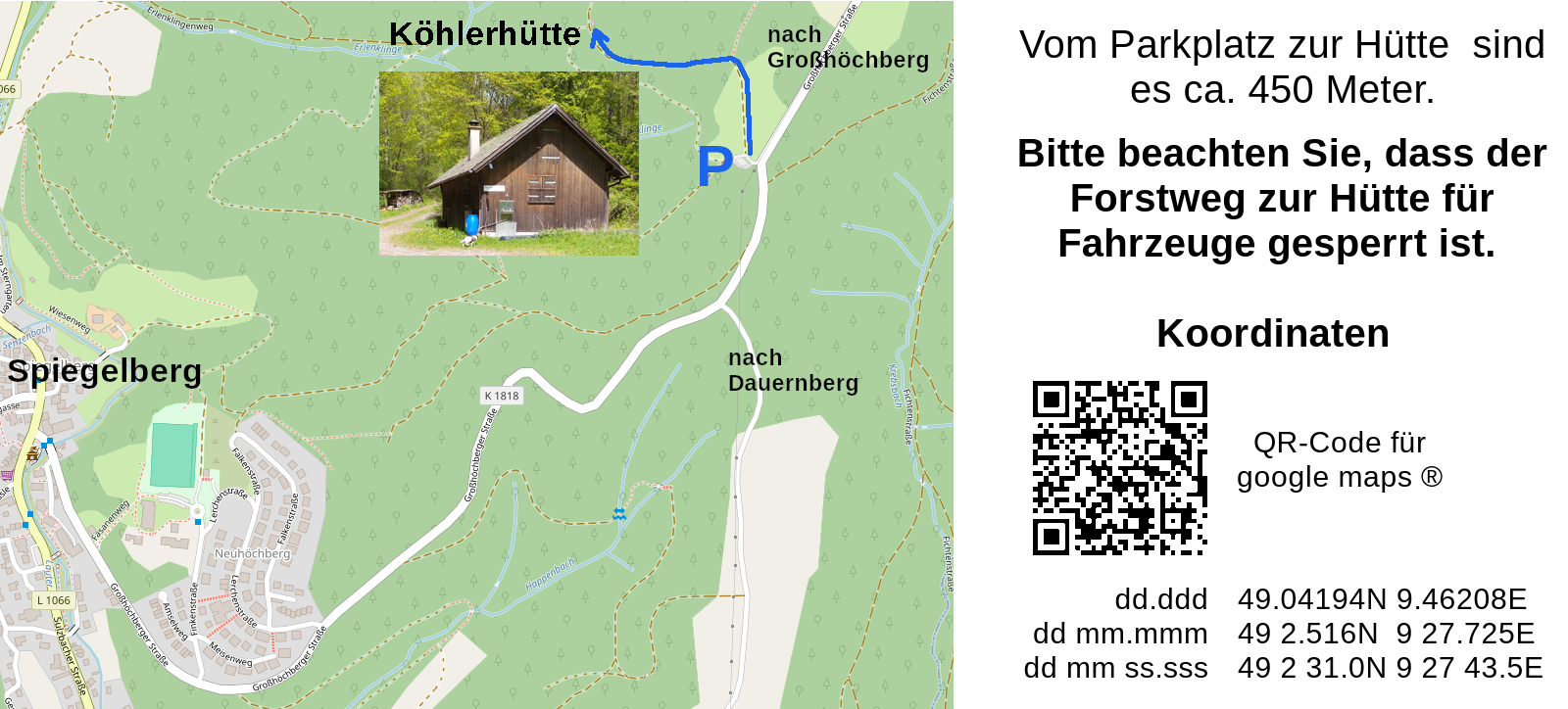 | Im Sterngarten/Feuerwehr Spiegelberg | 49.04085N, 9.44574E | 49°2.451000'N 9°26.744400'E | 49°2'27.060"N 9°26'44.664"E |  | Parkplatz Linde Vorderbüchelberg | 49.06394N, 9.44787E | 49°3.836940'N 9°26.872200'E | 49°3'50.2164"N 9°26'52.332"E |